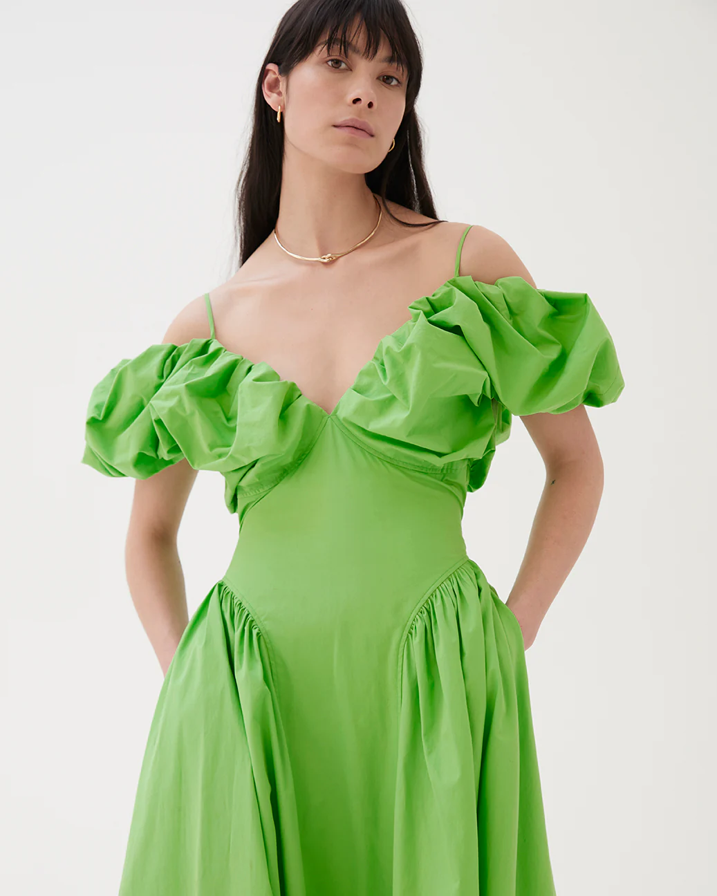 As featured in the AW22 show, the Rejina Pyo Erin Dress in Organic Cotton Lime is an off-the-shoulder dress. Decorated with slim shoulder fastenings, and puffed sleeves.