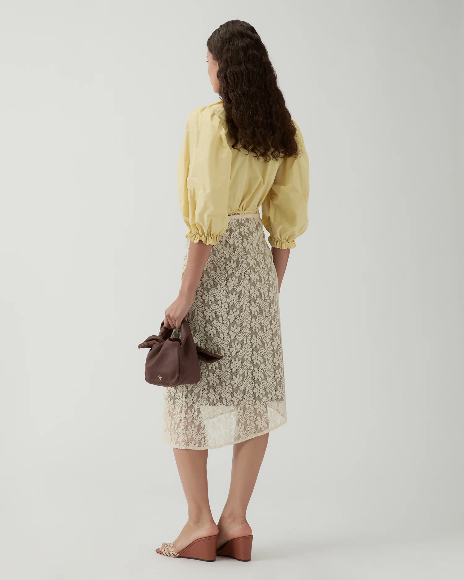 The Rejina Pyo Eva Skirt in Floral Lace Cream is an A line  mid length lightweight skirt with an asymmetrical hem detail.Â