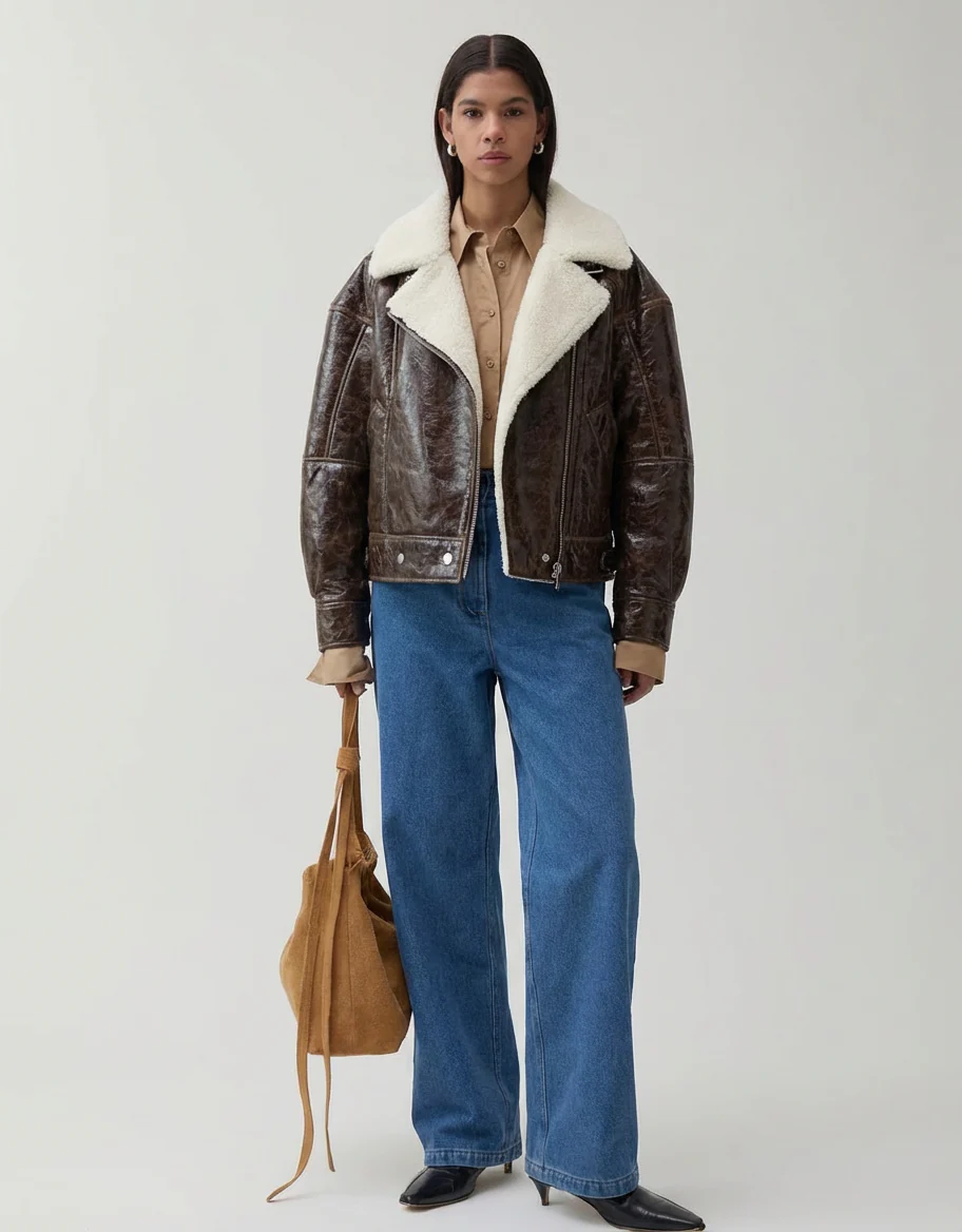 The Jordan Jacket in Shearling Brown is aviator jacket, with a cropped silhouette and plush shearling collar. Crafted from textured brown leather, it features an asymmetrical zip closure and snap-button details. Wear it with tall boot, skirts or trousers