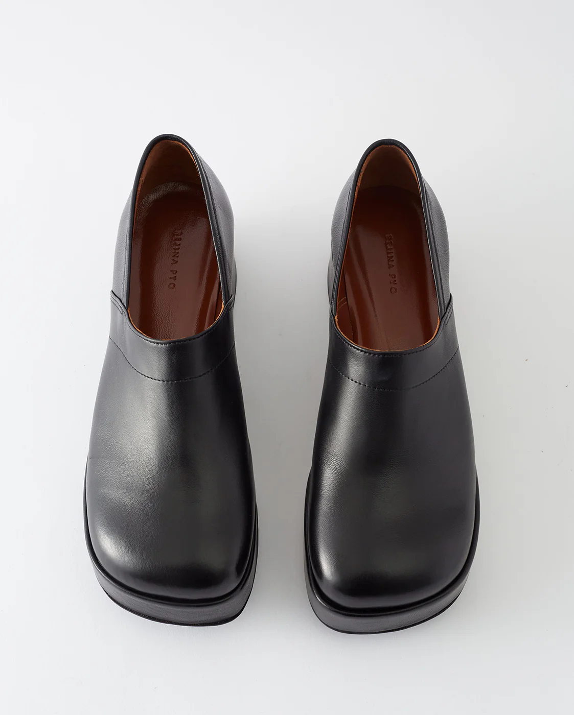 The Rejina Pyo Lucie Clogs in Nappa Leather Black are a versatile mid-height platform shoe with a rounded square toe and padded insole, made of leather sourced from Portugal.