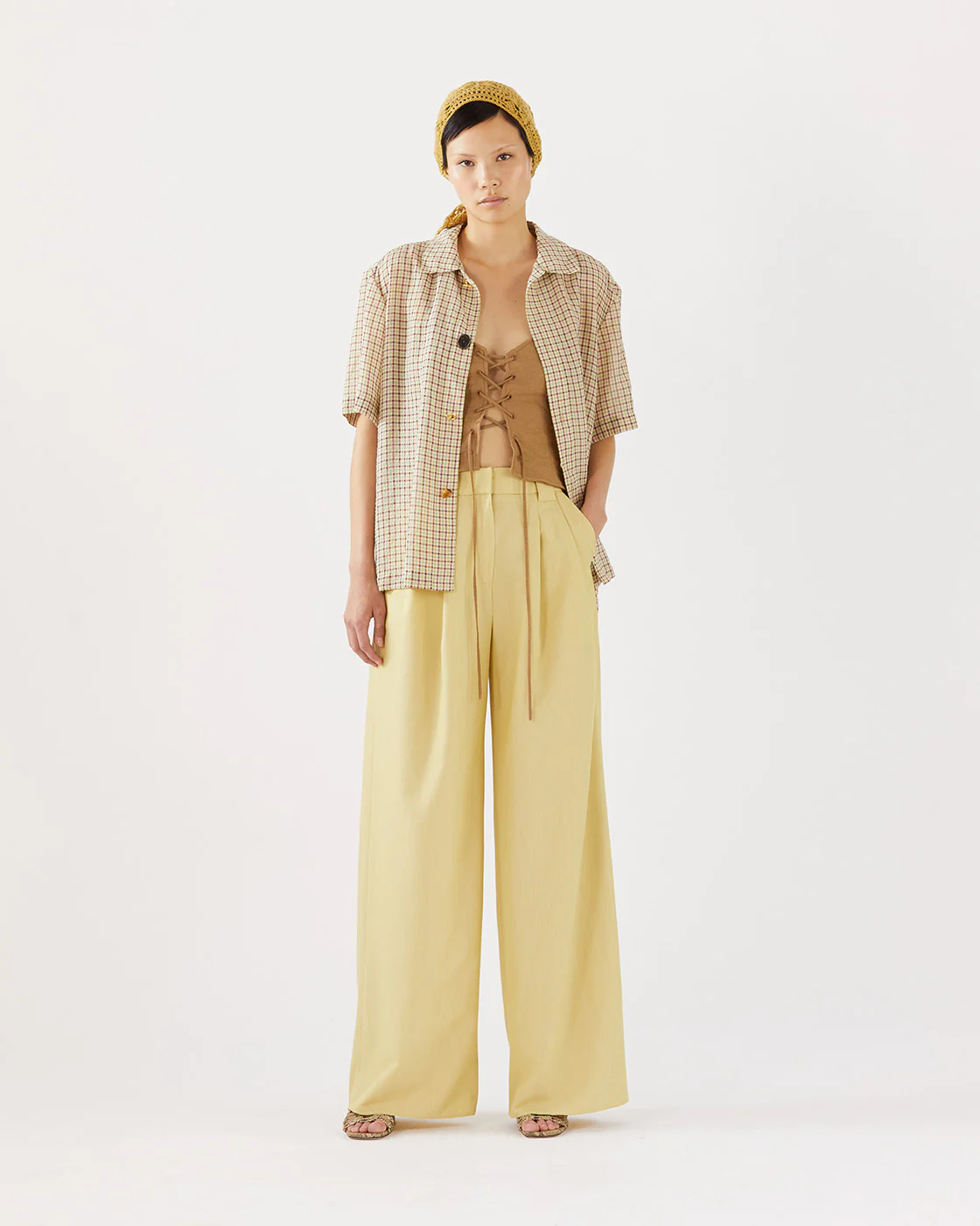 The Rejina Pyo Marty Shirt in Check Green is a short sleeved top with three buttons and a flat collar. The sleeves are roomy and bodice has a box cut to accomodate different body types.