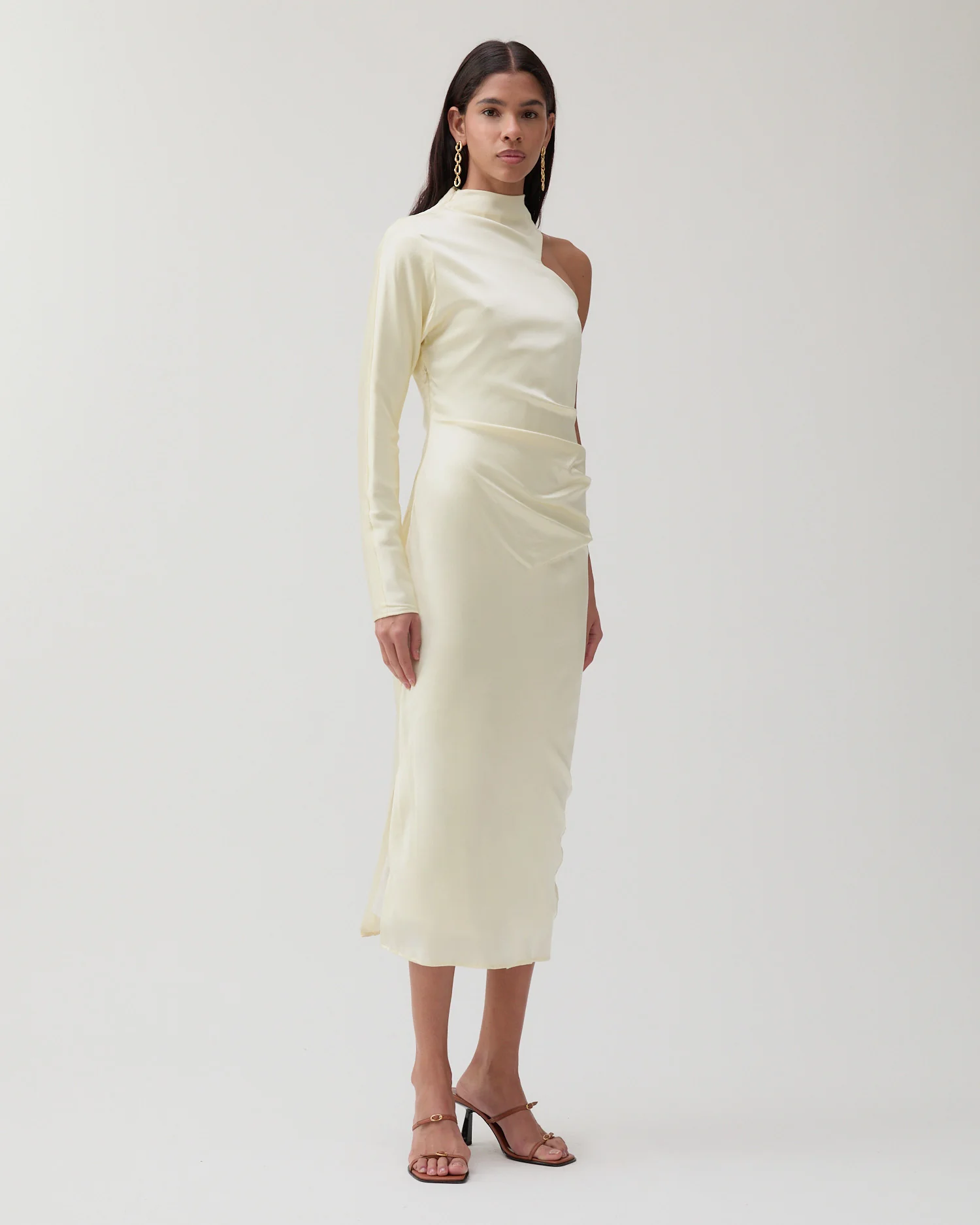 The Rejina Pyo Ola Dress in Silk Satin Butter is a one-shoulder midi dress with a mock neck, angular sleeveless cut on one side and long sleeve on the other. Features a slightly gathered waistline for definition and fits to your natural figure.
