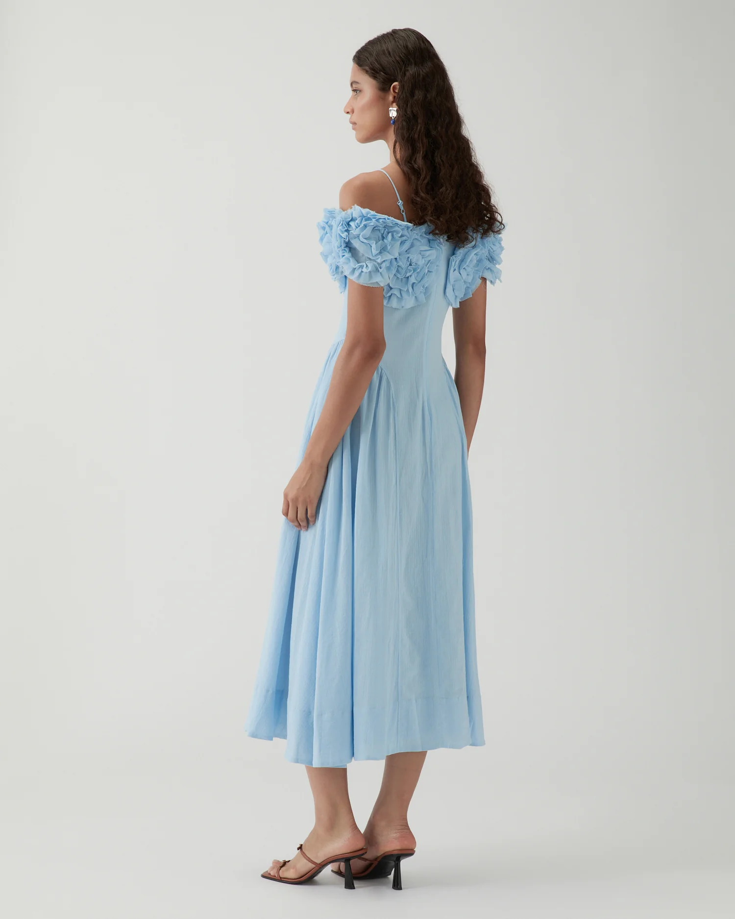 Introducing the Rejina Pyo Ophelia Dress - a graceful mid-length dress crafted from lightweight cotton. Adorned with delicate ruffles on the chest and shoulders, it boasts adjustable straps for a personalized and comfortable wear experience.