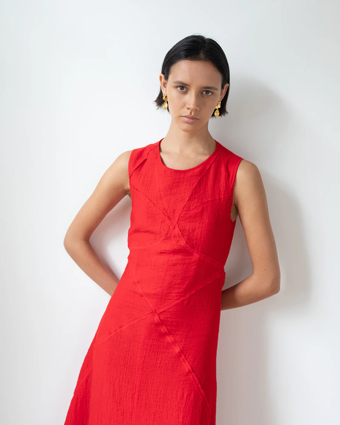 The Sadie Dress in Tencel Blend Red is both fitted and flattering, with a sophisticated mesh cutout detail at the neck adding a hint of sensuality. Its elegant construction also features a dramatic open back with tie detail, ideal for special occasions. Pair it with jewellery and a bold bag.