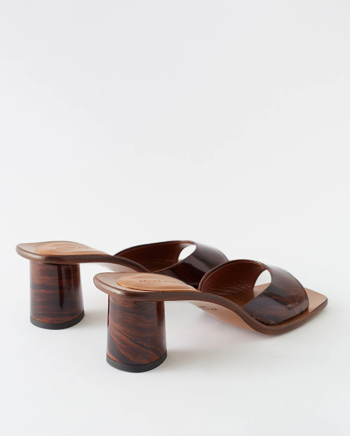The Rejina Pyo Selma Heels in Patent Leather Wood Brown are a mid-height block heel with a square toe, leather soles and wide single strap that is straight along the toes and rounded towards the arch.