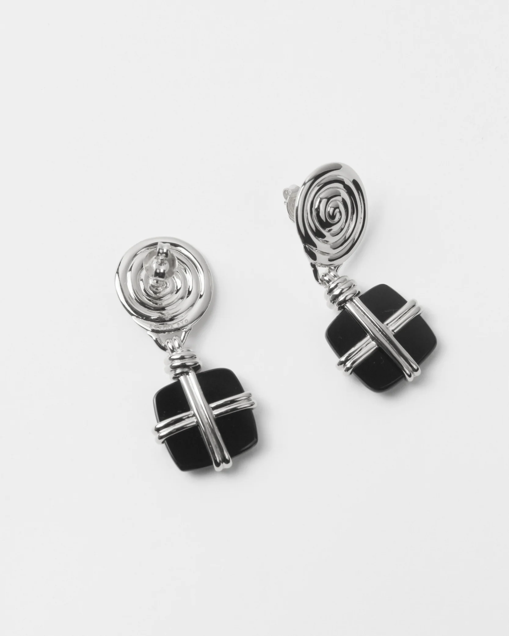 Artful earrings with a swirling base and black onyx drop with cross detail. Silver-plated, lightweight, and ideal for dressing up any occasion, or elevating a casual look.
