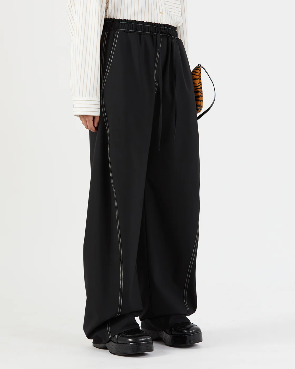 The Rejina Pyo Una Trousers in Wool Blend Suiting Black are wide leg pants with contrast stitching and a drawstring waistline.